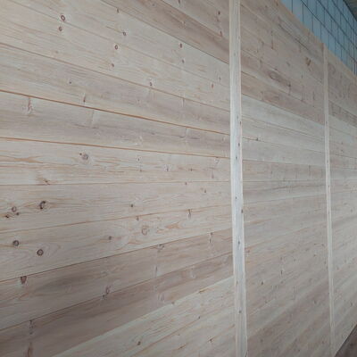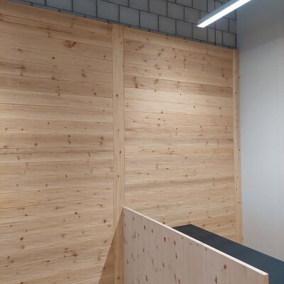 Wandverkleidung in Arve Massivholz, maschinell gehackt und behauen