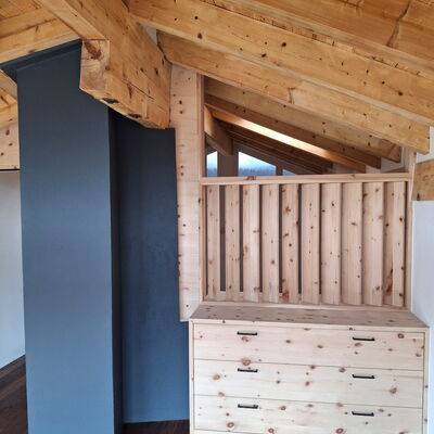 - Schrank im Esszimmer: Arve furniert, Innereien bestehende Tablare, Unterkonstruktion in Fichte Massivholz
