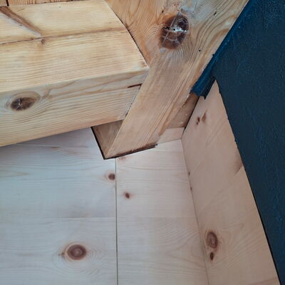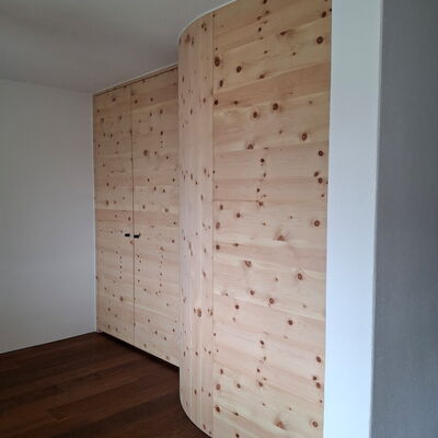 - Schrank im Esszimmer: Arve furniert, Innereien bestehende Tablare, Unterkonstruktion in Fichte Massivholz